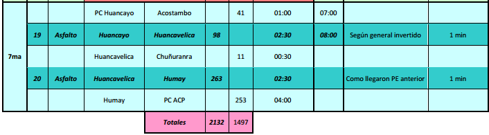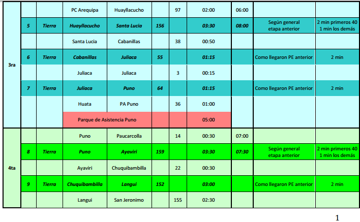 Según el documento enviado por la oficina de comunicaciones del Automóvil Club Peruano (ACP) se tiene que hay 11 tramos que se correrán sobre superficie de tierra y 09 sobre superficie de asfalto, haciendo un total de 20 tramos que serán debidamente cronometrados. Es decir hay un total de 2132 km. que son parte de las pruebas de velocidad válidas.